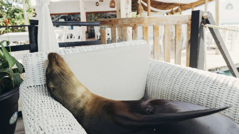 Sea lions rest near the hotel, native birds cross the sky, crabs move along the sand. Everything unfolds under one clear principle: observe, respect, do not intervene.